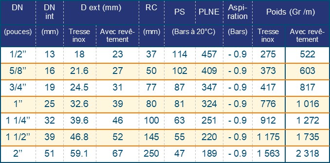 • Revêtement extérieur : sans revêtement (Tresse inox apparente) ou EPDM bleu ou noir antistatique (Autres couleurs sur demande) ou silicone blanc