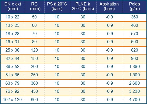 • Du DN 10 au DN 102 (voir tableau), DN 125 et 150 sur commande