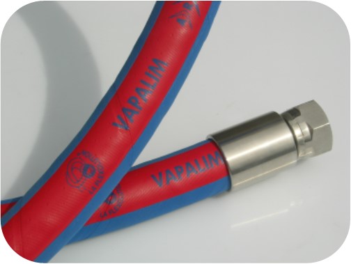 Revêtement extérieur : EPDM résistant aux UV, à l'ozone, à l'abrasion et au gras, de couleur bleue avec bande de marquage rouge
